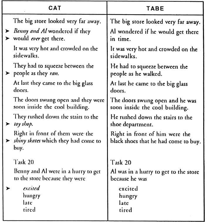 The confusing nature of this test material can be better understood if we trace where it comes from. In developing a test for adults, the test makers have adapted material from the California Achievement Test (1970), a test designed for children in elementary school (using material written for children in teaching adults is not uncommon). In order to facilitate your comparing the two versions of the test material, I have placed the children’s version on the left and the later version for adults on the right: